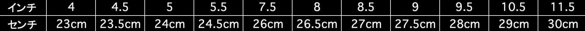 SIZE 4(23cm), 4.5(23.5cm), 5(24cm), 5.5(24.5cm), 7.5(26cm), 8(26.5cm), 8.5(27cm), 9(27.5cm), 9.5(28cm), 10.5(29cm), 11.5(30cm)